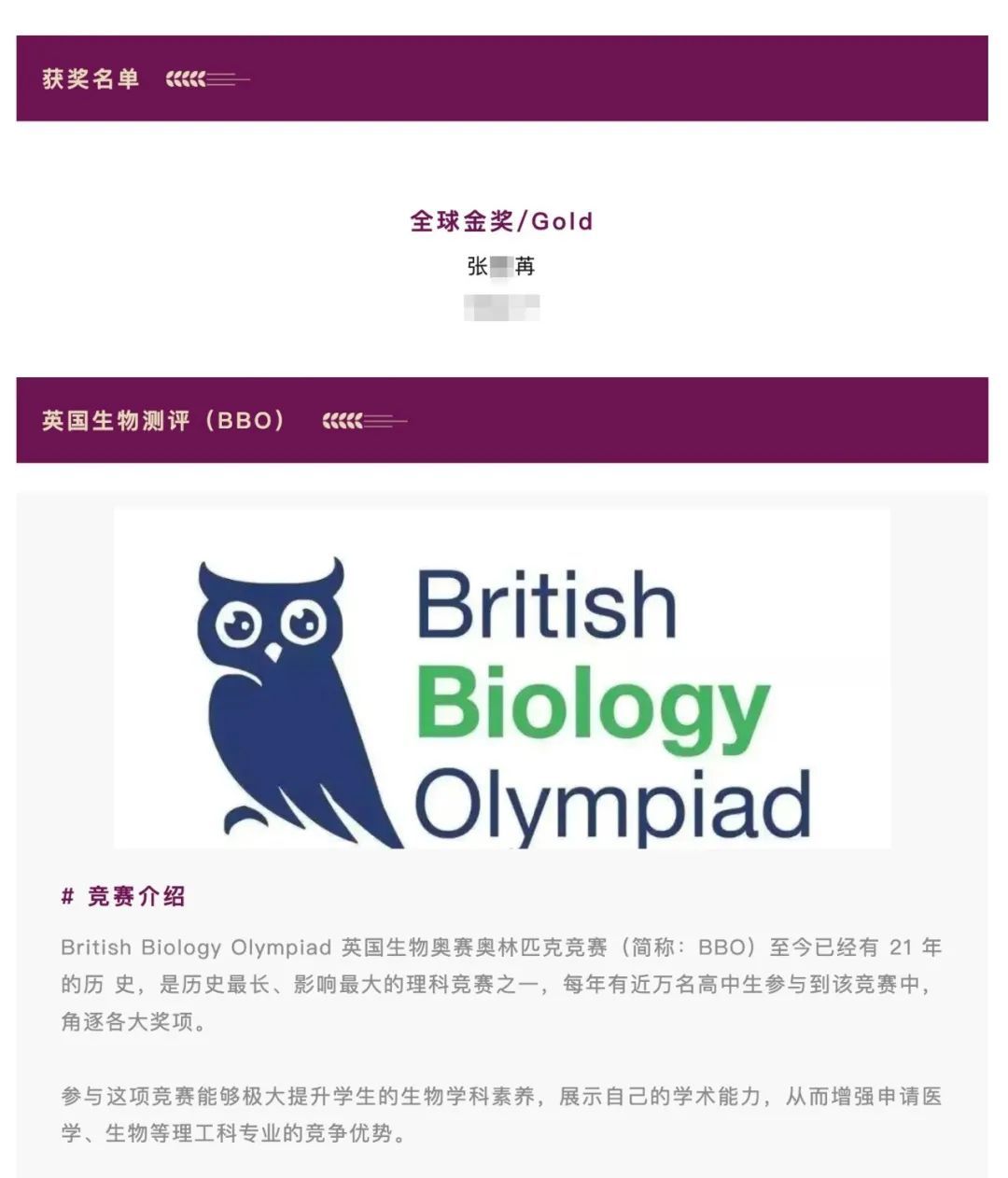 2023年英国生物奥林匹克竞赛(BBO),张某苒赢得全球金奖