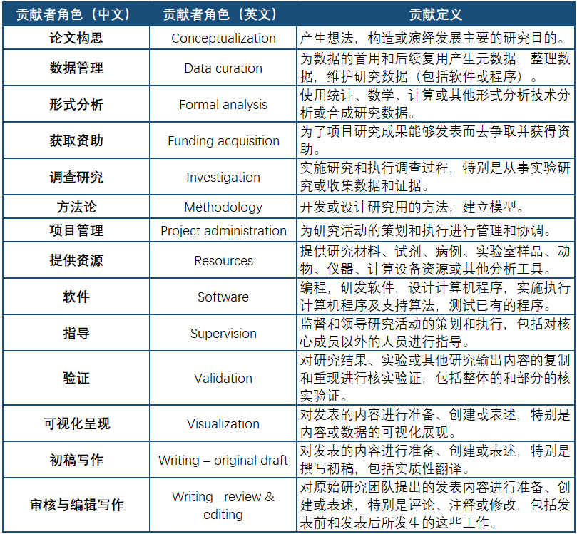 2020年,好意思国国度信息尺度协会在该原则的基础上,制定了“孝顺者变装分类(CRediT)尺度”,将论文孝顺细分红14类,如总体构念念、数据惩处、法式分析等。