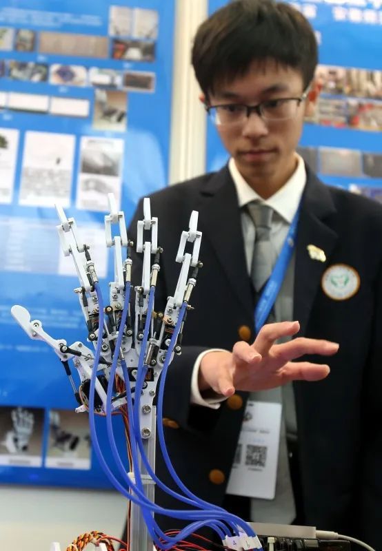 “未来小小科学家”竞赛选手展示我方的科创名堂“仿盼望械手” / 图源:新华社