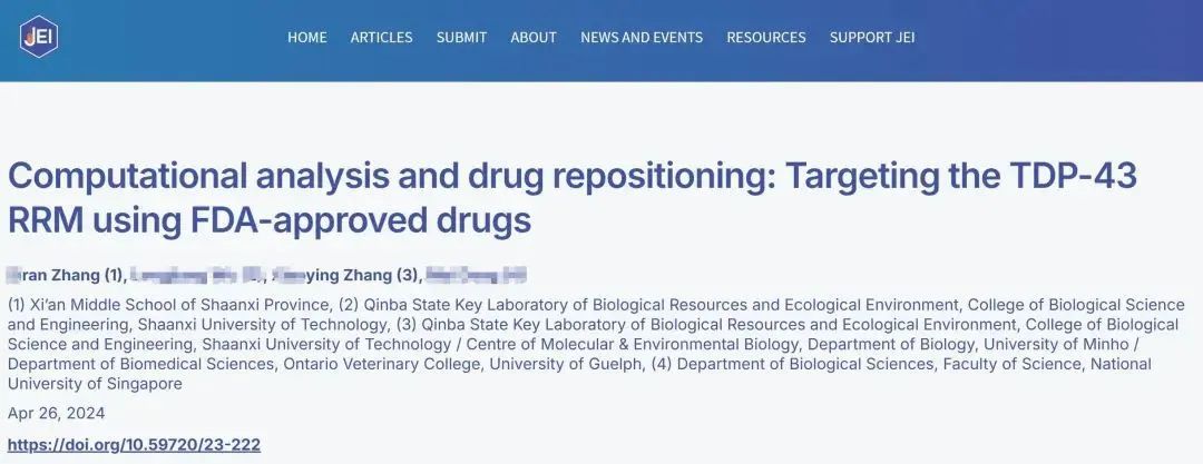 另一篇签字第一作家的论文,题目是《盘算分析和药物再诈欺:针对TDP-43 RRM使用FDA批准的药物》,聚焦TAR DNA联结卵白(TDP-43)这一神经退行性疾病的病理学象征卵白——其特殊鸠合,通常被以为与亨廷顿氏症、肌萎缩侧索硬化症和额颞叶拘束症等荒原病联系。该论文于2024年4月在《The Journal of Emerging Investigators》(JEI)发表,JEI为非中枢期刊,主要当作学术考试平台。